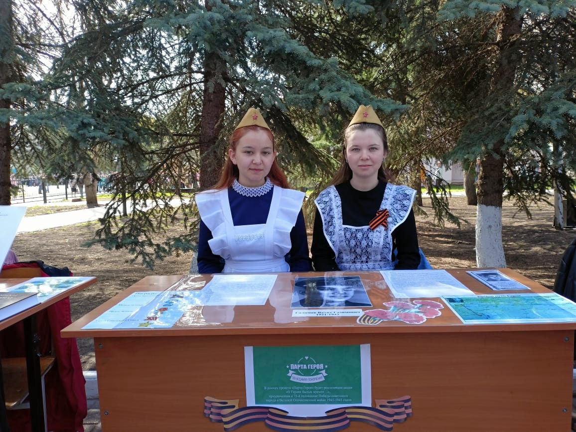 Учащиеся Загидуллина Чулпан и Бадертдинова Алсу участвовали в митинге в Парке Победы, посвящённый Дню Победы с проектом «Парта героя». Парта Героя – ученическая парта с размещенной на ней информацией о Герое Советского Союза Галимове Вахите Газимовиче.